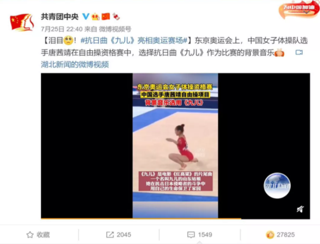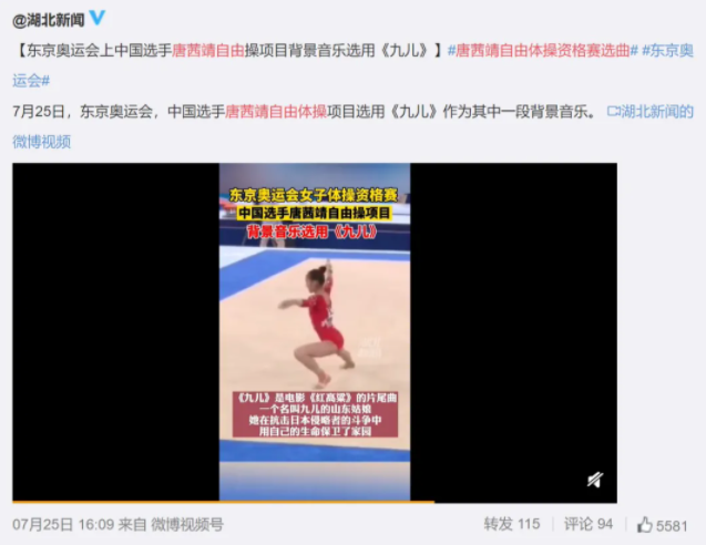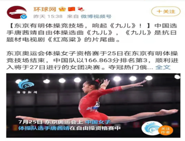 这首《九儿》,是徐中秋教授根据电影《夺冠》的插曲以及电视剧《红高粱》的片尾曲《九儿》重新编曲,悠扬而富有力量的编曲让中国女子体操队唐茜靖在东京奥运会自由操资格赛中脱颖而出。音乐《夺冠》的激昂澎湃极大地增强了唐茜靖自由操动作的节奏感与力量感,而当《九儿》的旋律响起时,又让整套自由操的编排有了跃动的情感变化,提升了艺术表现力。