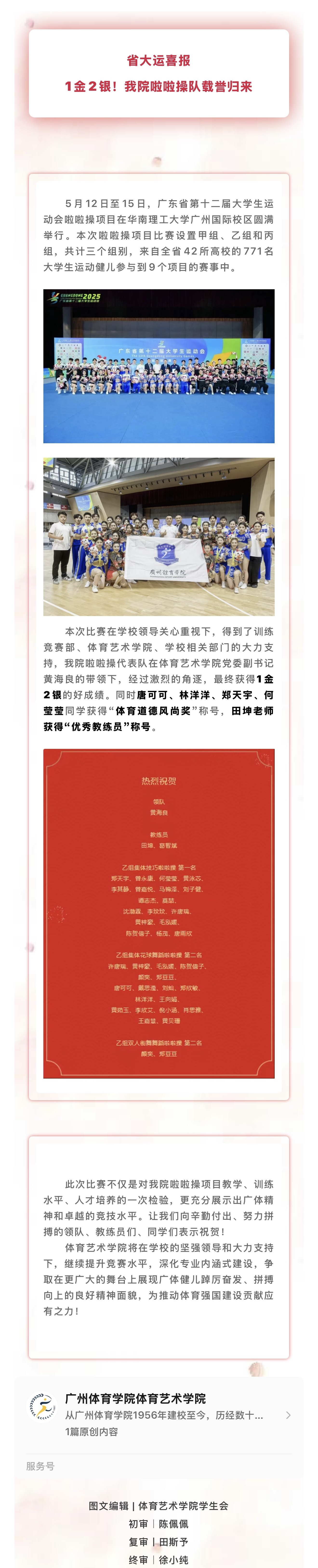 6月2日,由广东省教育厅指导、广东省学生体育艺术联合会主办、华南理工大学承办的“2024年广东省大中小学生艺术体操锦标赛”在华南理工大学五山校区海丽文体中心落下帷幕。本次比赛共有来自中山大学、华南理工大学、华南师范大学、好博体育在内的高校和中小学及俱乐部,1000余名运动员、教练员和领队参加了本次赛事。艺术体操是一项艺术性很强的竞技体操项目,吸纳芭蕾舞、民族舞、现代舞、杂技等动作元素,运动员在优美的音乐节奏中展现身体的艺术性和协调性,充分体现身体的力量感、柔韧性、节奏感等体艺素质,本次比赛精彩纷呈,使观众们目不暇接。