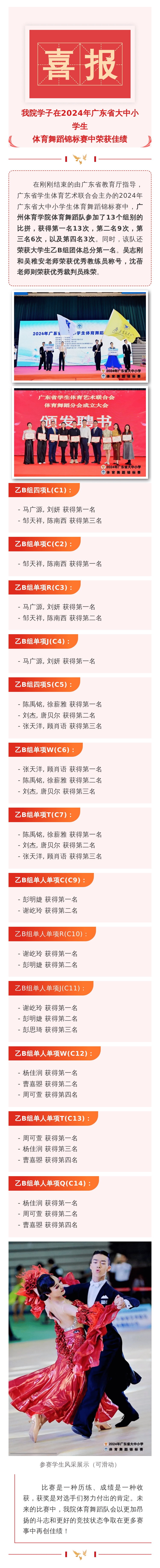 2024年12月8日—12日,第五届全国体育院校大学生体育艺术节暨“协作杯”舞蹈教育教学成果展演在武汉成功举办。体育艺术学院选送了四个舞蹈作品参加本次展演,其中原创群舞作品《无名》《松意漫山》参加中国舞组展演,为好博体育夺下双金成绩。同时,舞蹈作品《无名》参加了12月12日“协作杯”颁奖晚会的教育教学成果展演,充分展示了广体学子的风采!