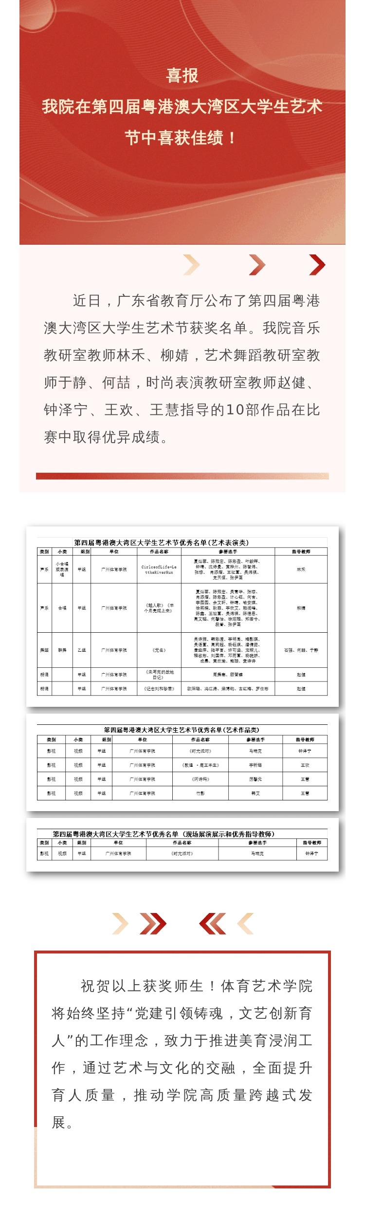 2023年10月27日,由广东省教育厅、粤港澳大湾区音乐教育与艺术发展联盟主办,南方科技大学承办的“第三届粤港澳大湾区大学生艺术节”在深圳成功举办。艺术节以“多彩大湾区,艺起向未来”为主题,在为期三天的活动中,先后开展开幕仪式、大学生音乐舞蹈艺术展演、大学生美展、高校美育论坛等精彩活动。 体育艺术学院原创群舞作品《松意漫山》参加舞蹈展演专业组比赛,在初赛中脱颖而出,入围决赛,与十六个优秀节目进行角逐,最终荣获舞蹈展演专业组二等奖。