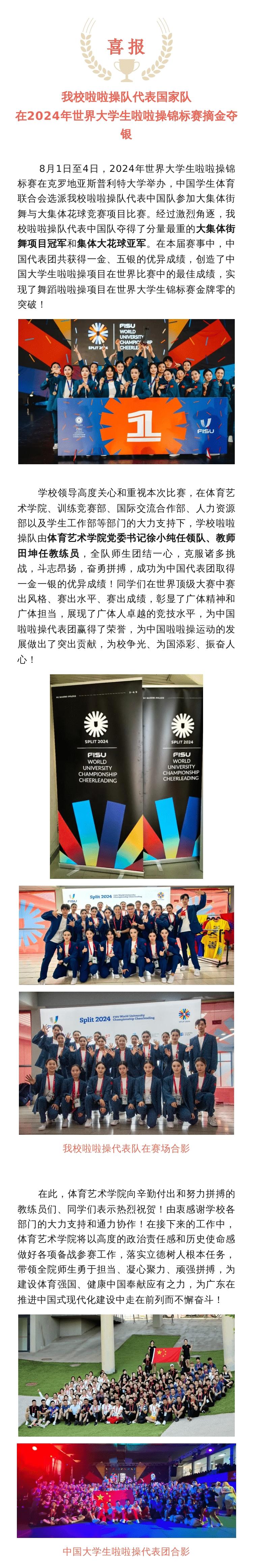 2024年11月17日至21日,由中国学生体育联合会主办的2024年中国大学生艺术体操锦标赛在儋州市海花岛会议中心顺利举行。我校艺术体操代表队在领队体育艺术学院党委书记徐小纯和教练员王静、宋亚超老师的带领下,队员们凭借出色的团队协作以及对艺术的深刻理解,赢得了评委和观众的一致好评,经过激烈的角逐,最终获得5金2银3铜的成绩,同时我校荣获“体育道德风尚奖”单位,王静老师荣获“优秀教练员”称号。