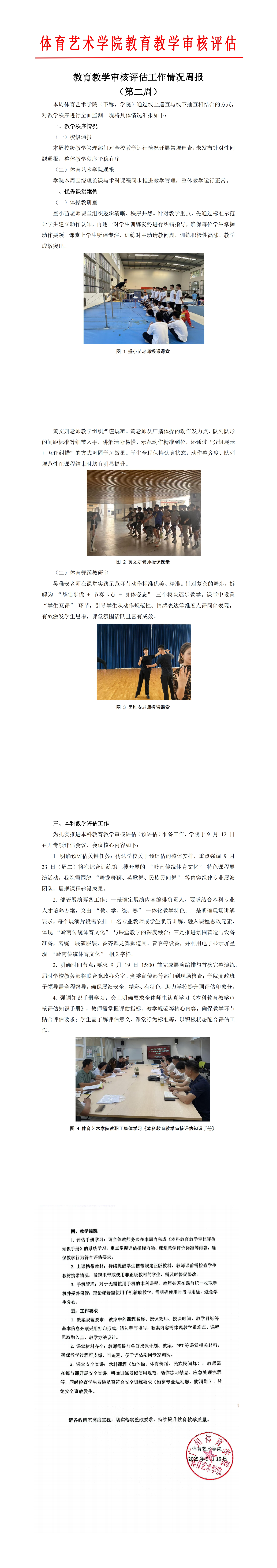 本周,体育艺术学院紧扣审核评估核心指标,运用课堂巡查、师生访谈、教学资料抽查等多种方式,深入教学一线,全面剖析教学运行情况。整体而言,学院教学工作态势良好,教学秩序井然,教师教学热情高涨。