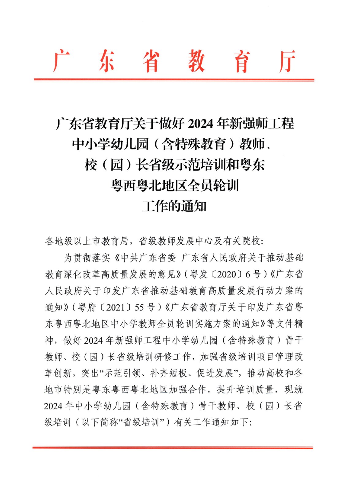 广东省教育厅关于做好2024年新强师工程中小学幼儿园(含特殊教育)教师校(园)长省级示范培训和粤东粤西奥北地区全员轮训 工作的通知