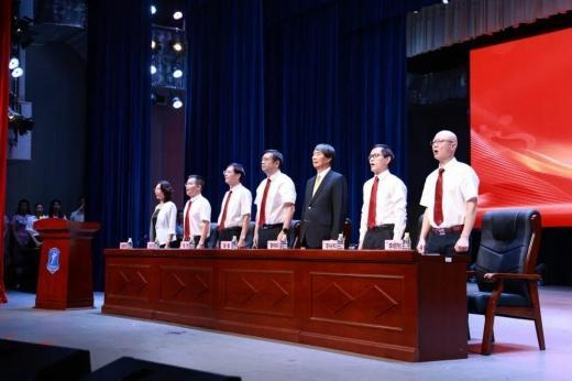 大会第一项是新进教师入职宣誓仪式。在2024年全国教育科学规划基金项目获得者、青年教师代表项明强教授的领誓下,新进教师代表们面向国旗庄严宣誓。
