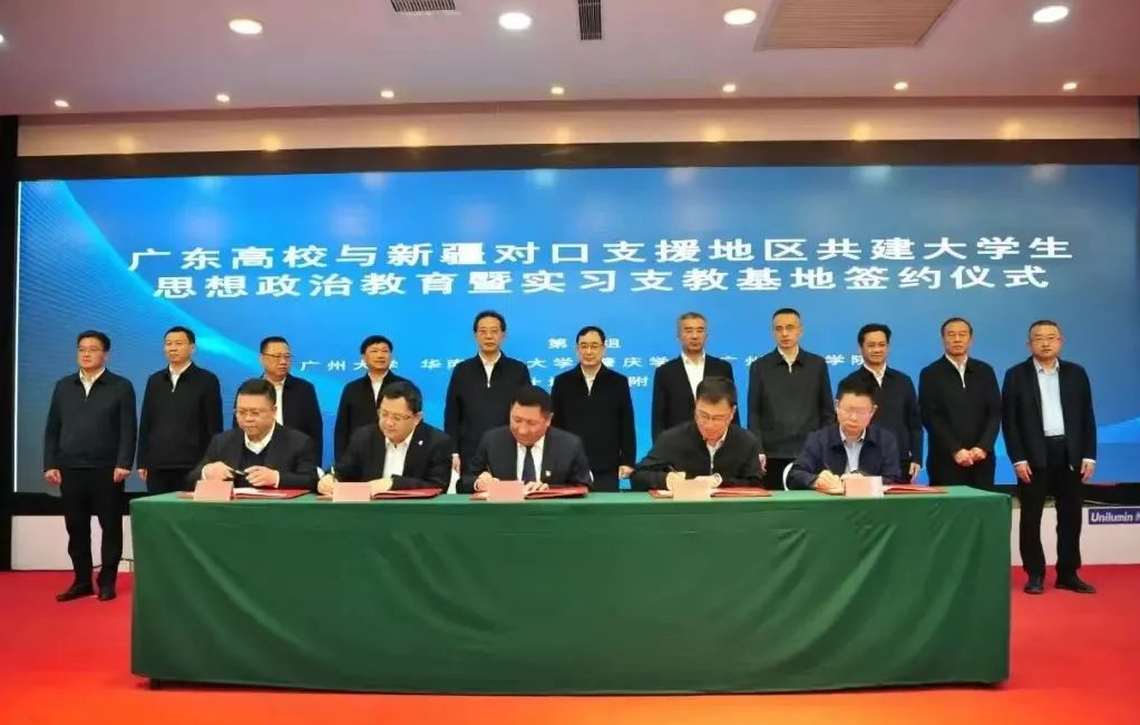 本网讯 3月26日,广东高校与新疆对口支援地区共建大学生思想政治教育暨实习支教基地签约仪式在新疆喀什举行,粤新两地领导出席签约仪式。学校党委书记米银俊与疏附县委副书记、县长阿卜拉江·萨迪克签署校地合作协议书,学生工作部(处)部(处)长廖远胜代表学校参加大学生思想政治教育暨实习支教共建基地揭牌仪式,并介绍好博体育援疆支教的经验做法与特色亮点。