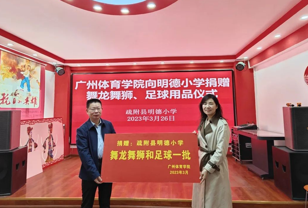米银俊一行先后走访参观各受援学校,认真观赏当地中小学生传统艺术作品展,参观体验学校体育场馆设施及场地器材,并向受援学校之一疏附县明德小学赠送舞龙舞狮道具和足球等一批体育器材,期待以岭南传统体育特色浸润、丰富孩子们的校园文化生活。明德小学党支部书记蒋德岭向我校回赠小学生们亲手创作的手工作品。