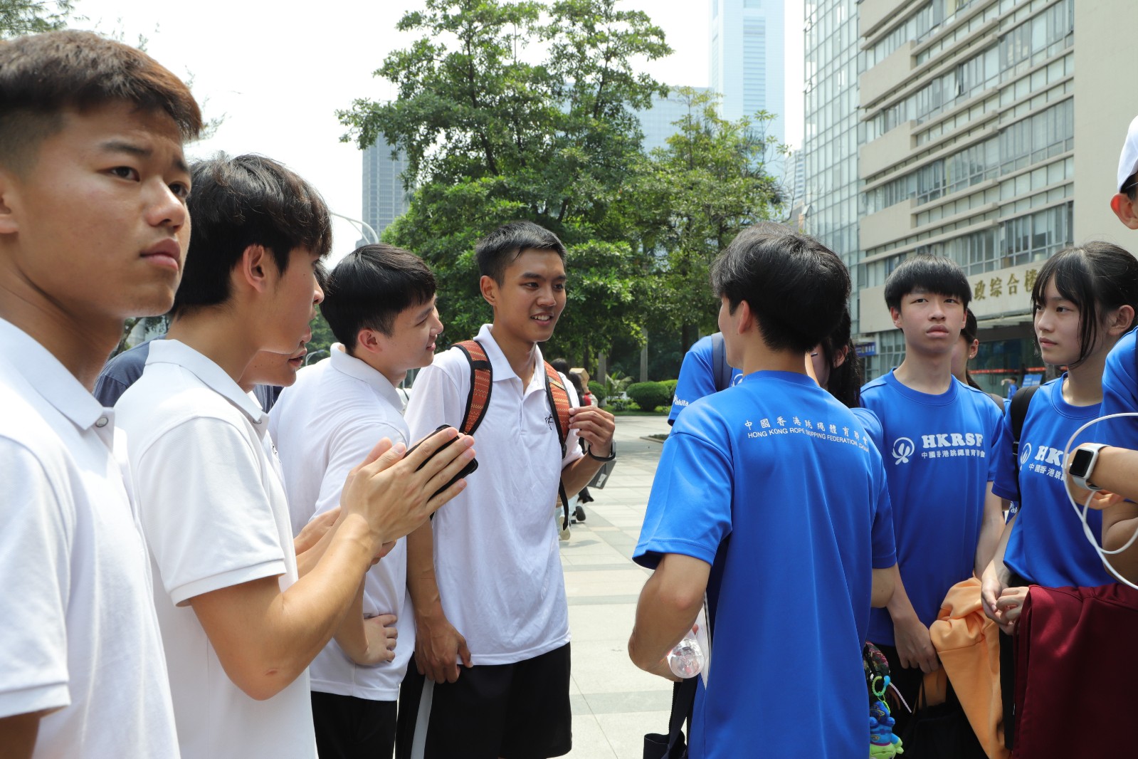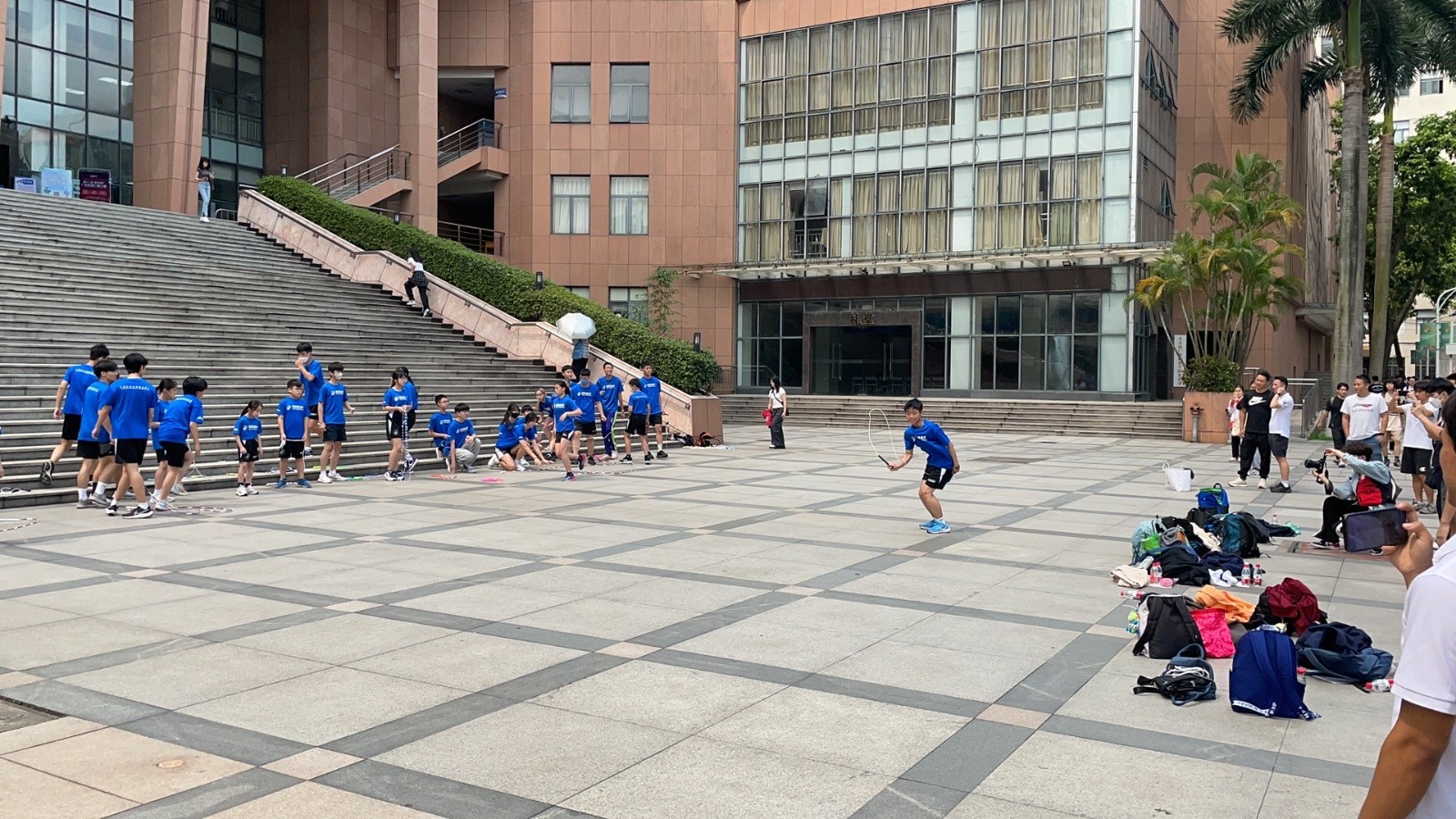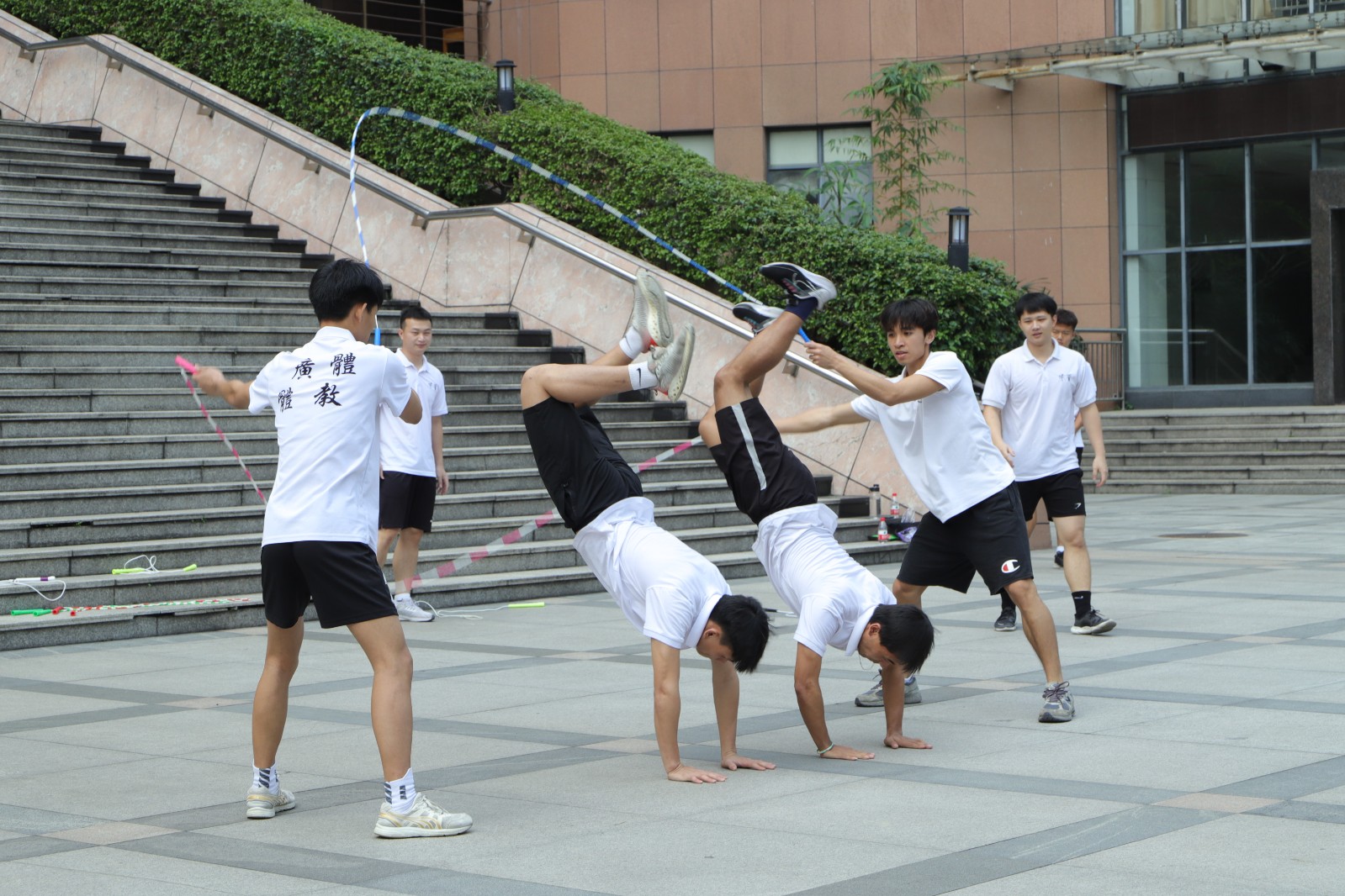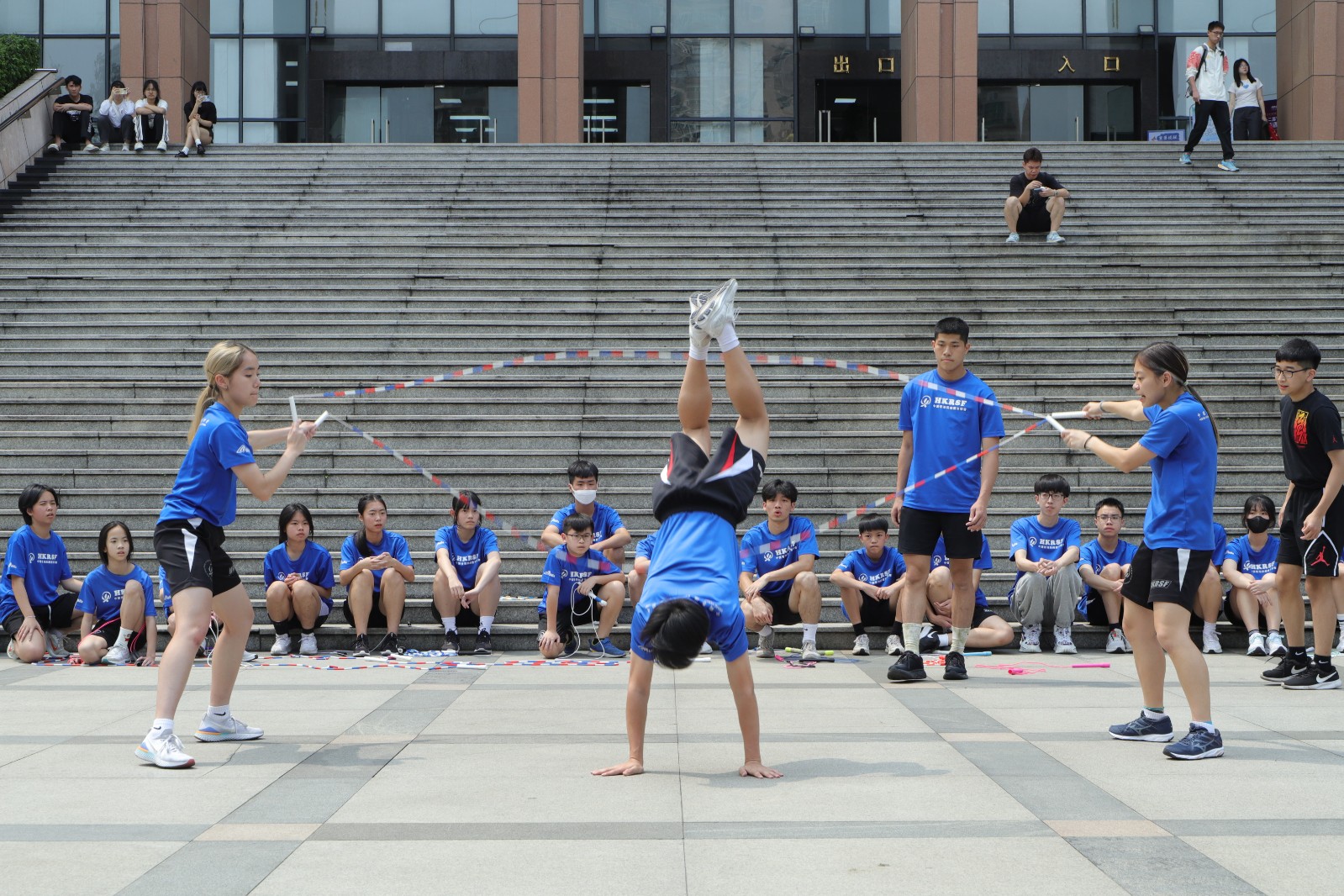 座谈会后,中国香港跳绳体育联会队员与我校休管学院跳绳队同学在图书馆前广场交流训练成果。