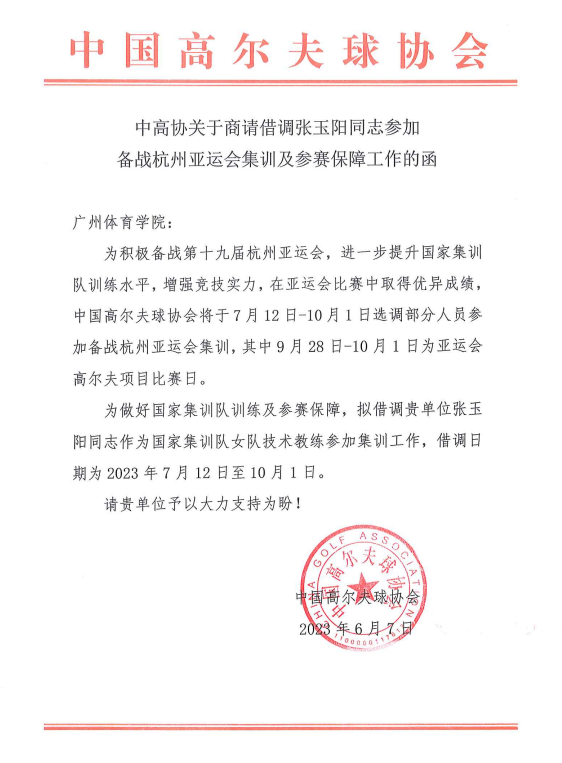 我校休闲与数字体育学院高尔夫教研室教师张玉阳被国家队借调执教,备战2023年亚运会