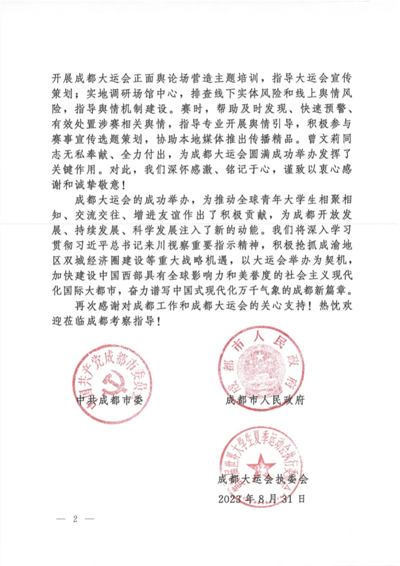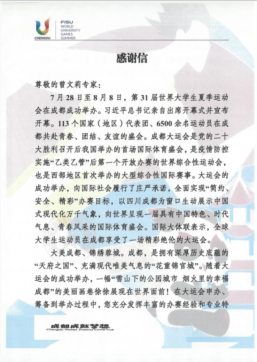 中共成都市委、成都市人民政府、成都大运会执委会特向我校及曾文莉教授发来感谢信: