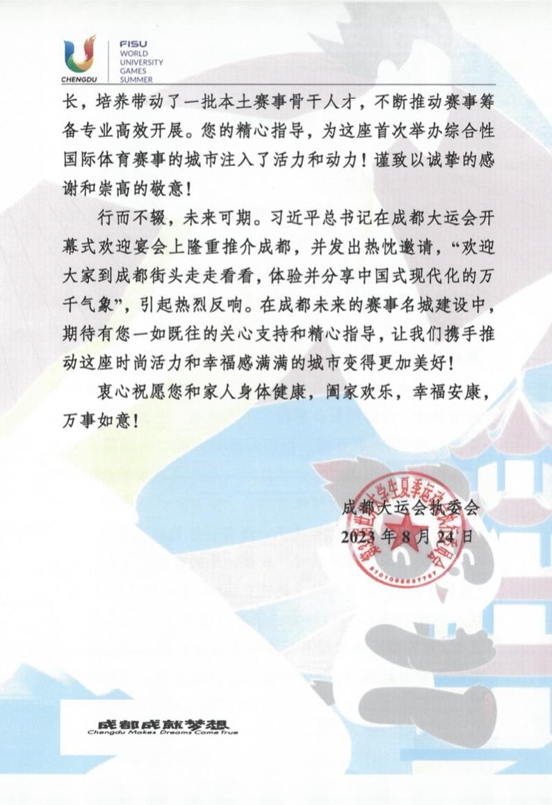 成都大运会向世界呈现了一届具有中国特色、时代气息、青春风采的国际体育盛会。两封感谢信,既是对我校能力的肯定,更是对我校未来工作开展的激励。我校将继续与各方合作,为各项体育赛事作出贡献。