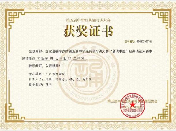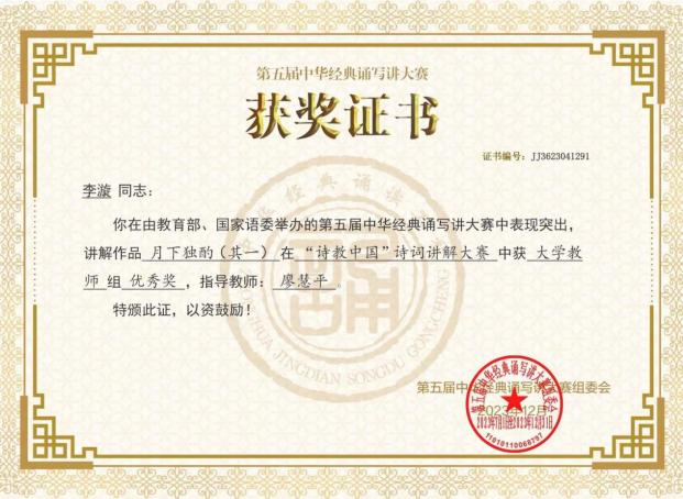 本网讯 近日,由教育部、国家语委主办的第五届中华经典诵写讲大赛公布获奖名单,我校师生在经典诵读大赛和诗词讲解大赛中取得两项佳绩。