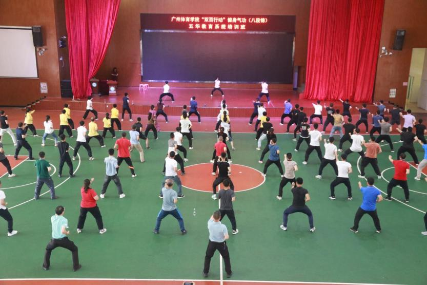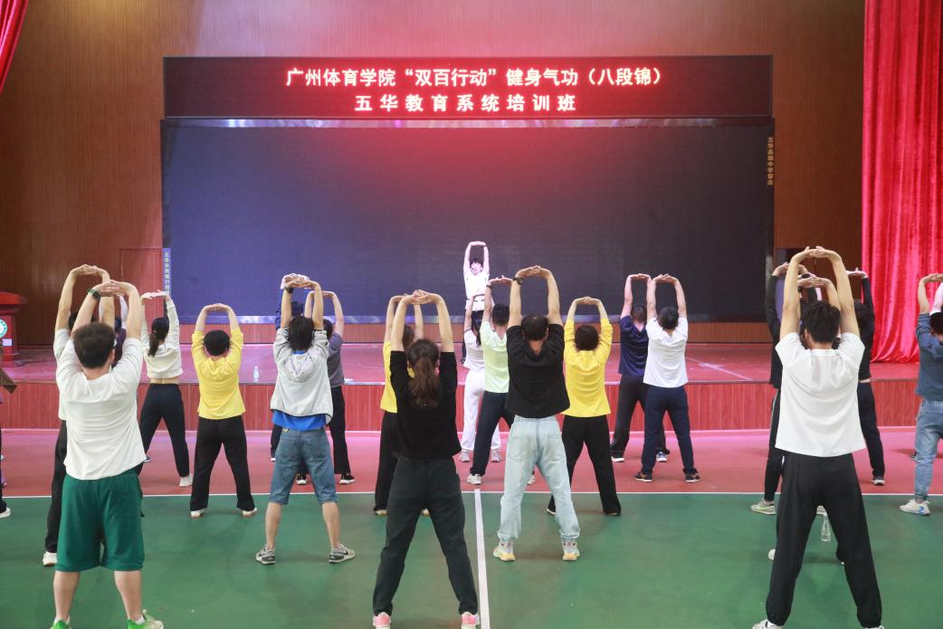 本网讯 为贯彻落实广东省百校联百县助力“百县千镇万村高质量发展工程”行动要求,让“双百行动”走深走实,更好的推广传统体育进校园,助力五华县教育系统师生健康提升工作。4月11日-12日,广东省高校“双带头人”教师党支部工作室支部书记蔡莉教授带领我院健身气功专家团队到五华县,举办好博体育“双百行动”健身气功·八段锦五华教育系统培训班,为五华县90多名中小学体育骨干教师进行培训授课。