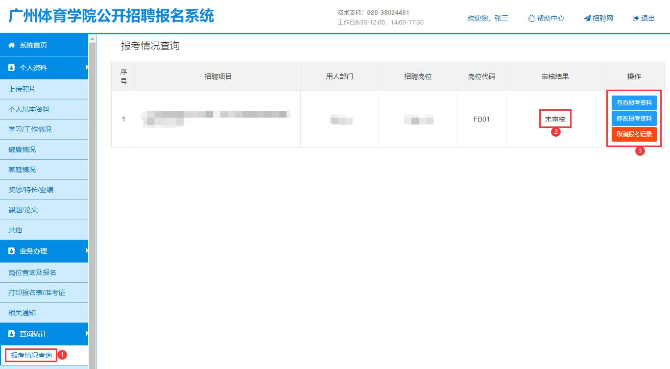 点击左边菜单“查询统计”下面的“报考情况查询”。